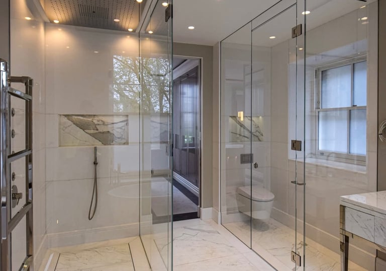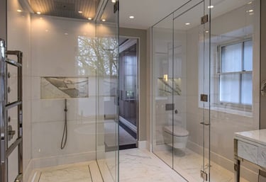 Custom bathroom remodeling with modern tile, glass shower, and high end finishes.
